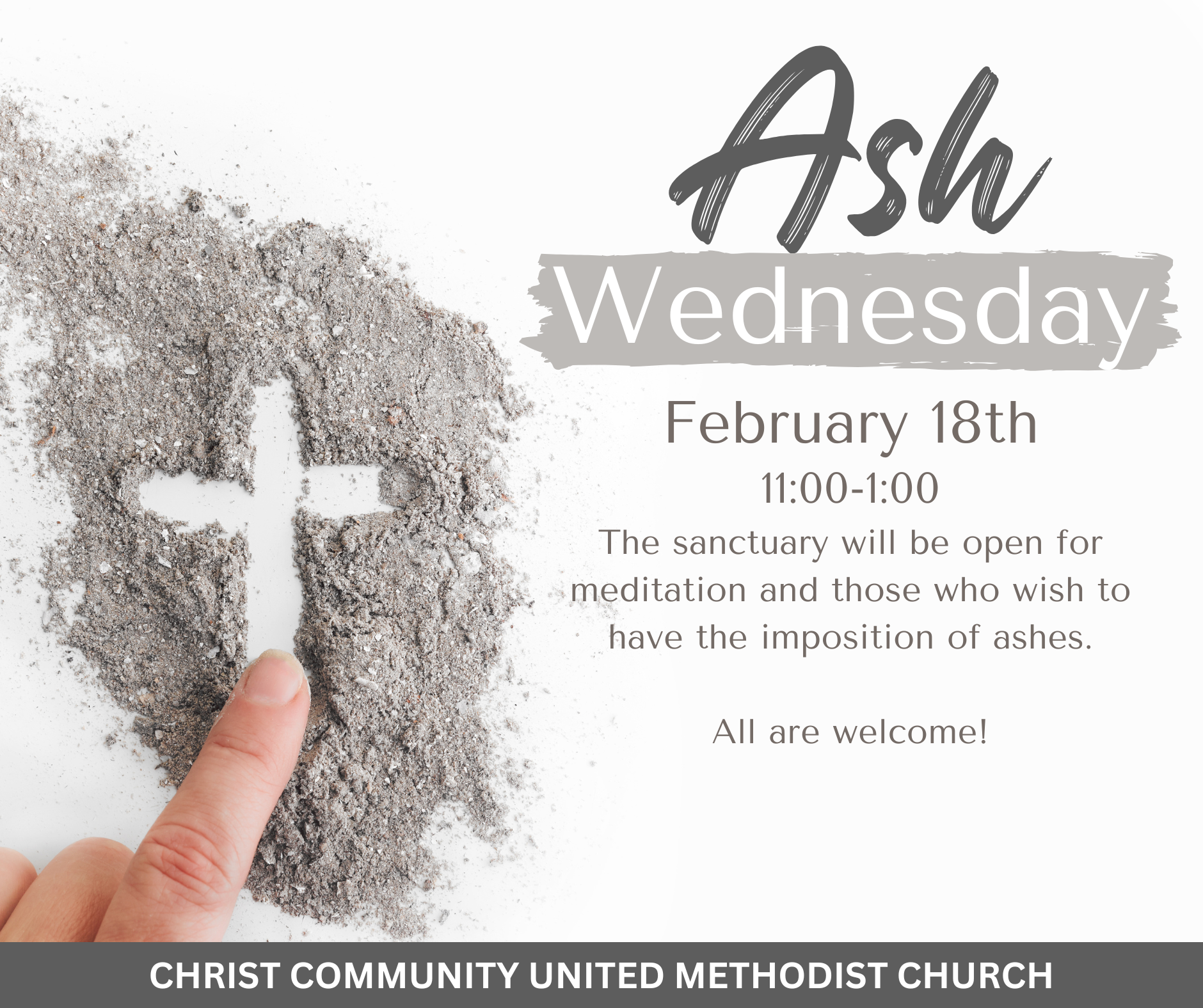 Feb 18 to Feb 19 Ash Wednesday Wed, Feb 18, 2026 11:00 AM 11:00 Thu, Feb 19, 2026 1:00 AM 01:00 Christ Community United Methodist Church (map) Google Calendar ICS View Event →